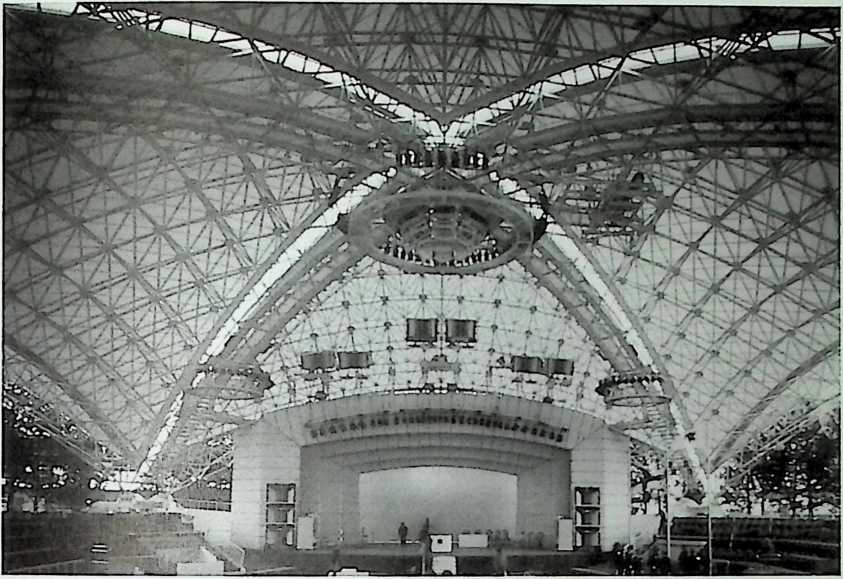 Because of its location and because of its function, a certain austerity is expected in the facade of a building like the Javits Center. What was called for in the theme building of the exhibition “Portopia ‘81’’ in Kobe, Japan, to celebrate the completion of a large artificial island, is very different. The open and cheerful structure is achieved solely with space frames. The airy elegance of this building, all curves and smiles, makes its loss to demolition regrettable. Conceived to resist the effects of typhoons and seismic forces, it would have been interesting to see how it would have fared in the powerful 1995 earthquake. The chapter, entitled Double Curvature Space Frames, is written by the engineer in charge, the talented Masao Saitoh.