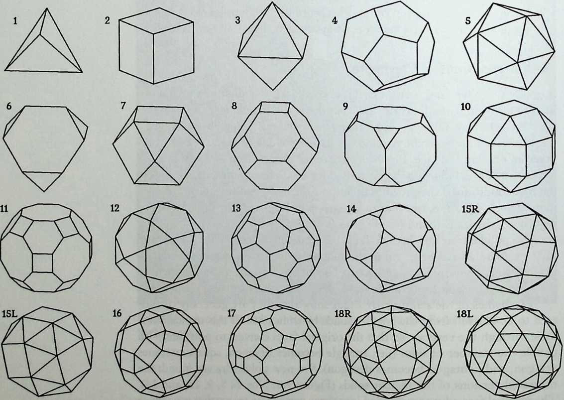 We return to earth, so to speak, with Ture Wester’s chapter, The Structural Morphology of Basic Polyhedra. Wester is also a structural engineer, and an imaginative one at that. He does not confine his thinking to post-and-beam structures stabilized by triangulation or other means. This would not do with polyhedra, the structural problems of which have little in common with those of their brother the cube. Three of the five regular polyhedra make perfect rigid lattices. They are the tetrahedron, the octahedron, and the icosahedron, which all have triangular faces. Three make perfect plate structures, and they are the cube, the dodecahedron and, again, the tetrahedron. These three have three-branched vertices. This observation forms the basis of Wester’s elegant general theory, structural duality, which leads to the formulation of simple rules for analyzing the rigidity of any arbitrary polyhedra, simple design methods for geometrically complicated but highly efficient plate structures, and other interesting possibilities. Some structures of the natural world are included in his demonstration.